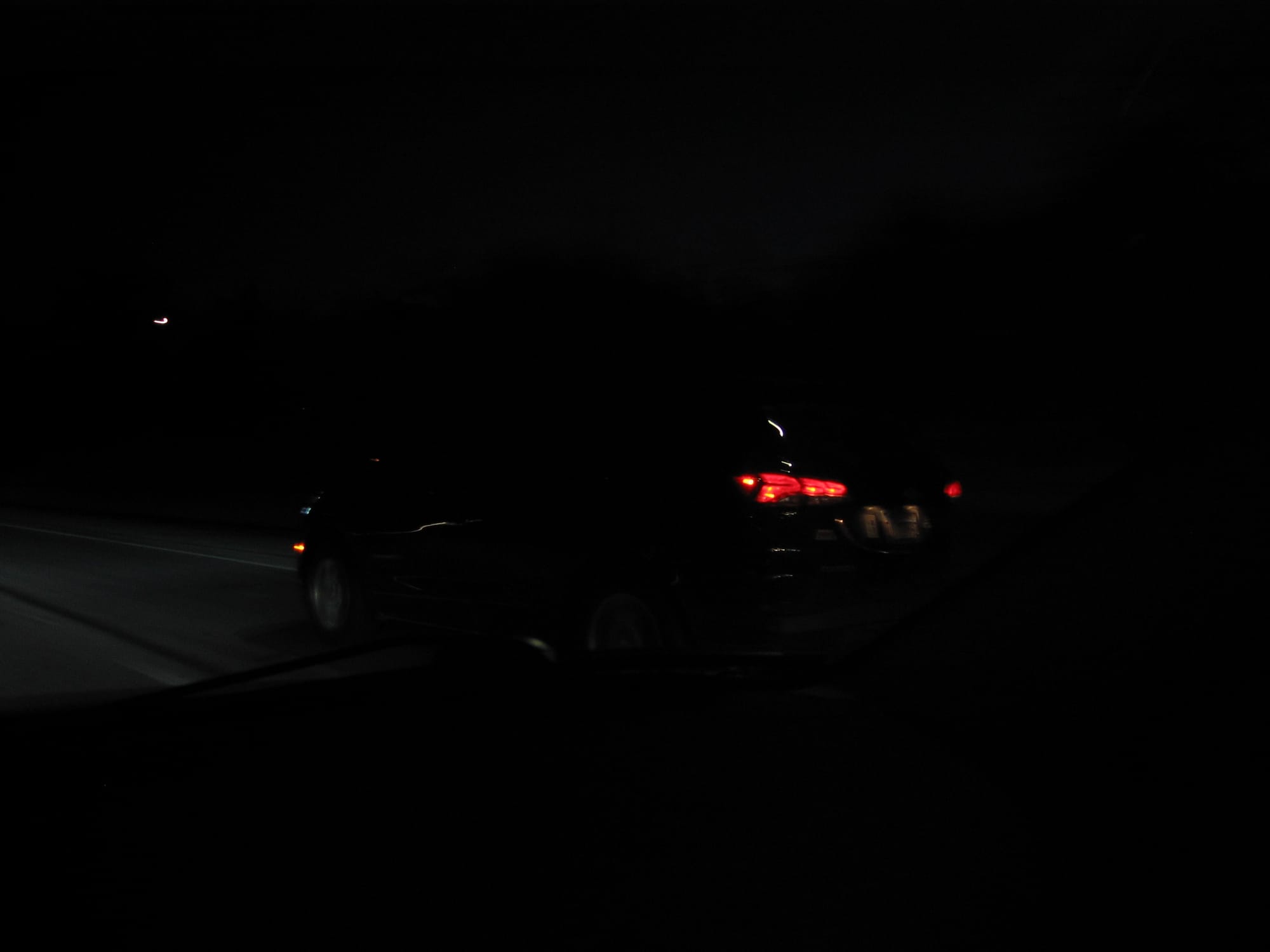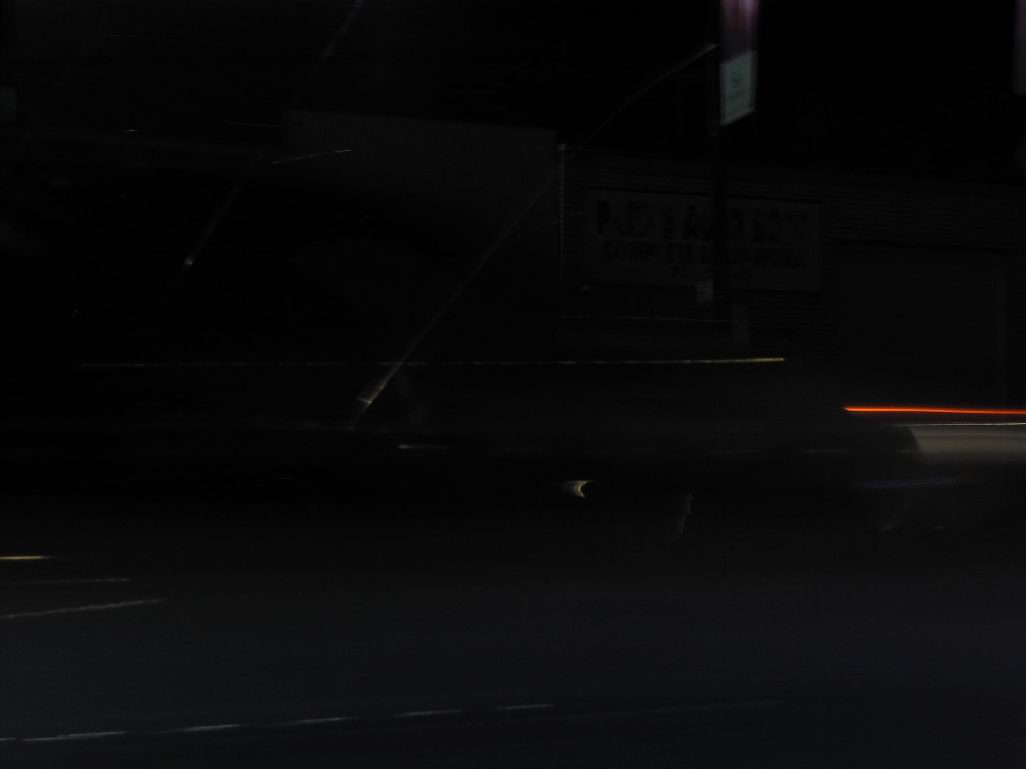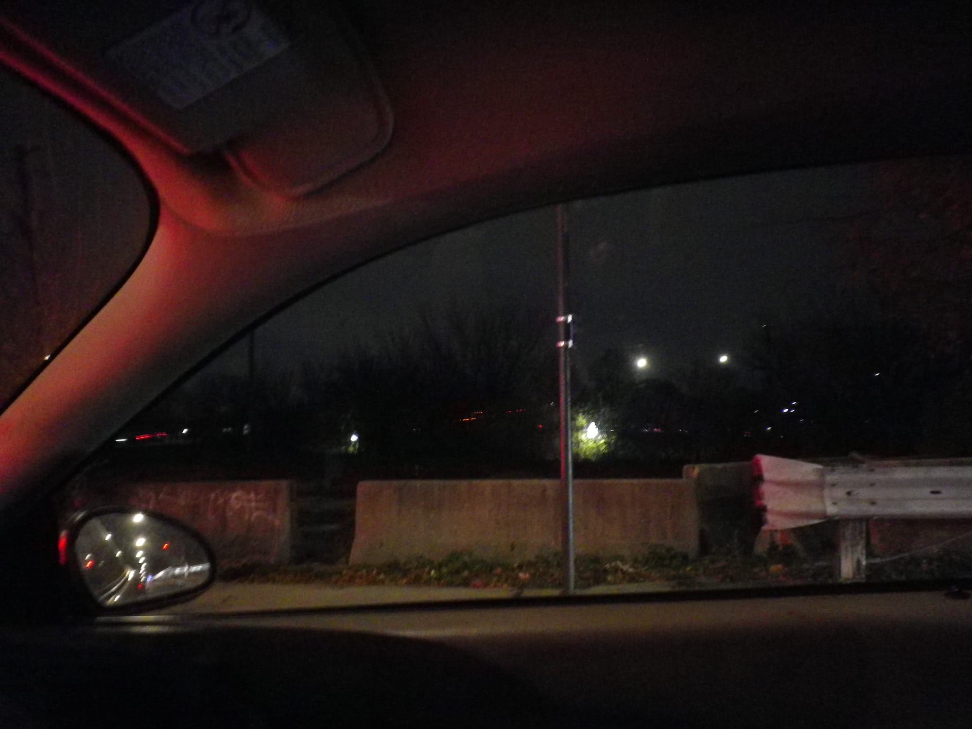 My technique for shooting in was to hit it without looking while holding the camera on my shoulder pointing out the driver's side window or sticking my arm straight out to take shots out the passenger side. Unsurprisingly, most of the pics are blurry, badly composed, or both. The stuff that sings to me, though, really feels worth taking 75 bad pictures to get to. It also feels good to make something while stuck out on the road in the dark.